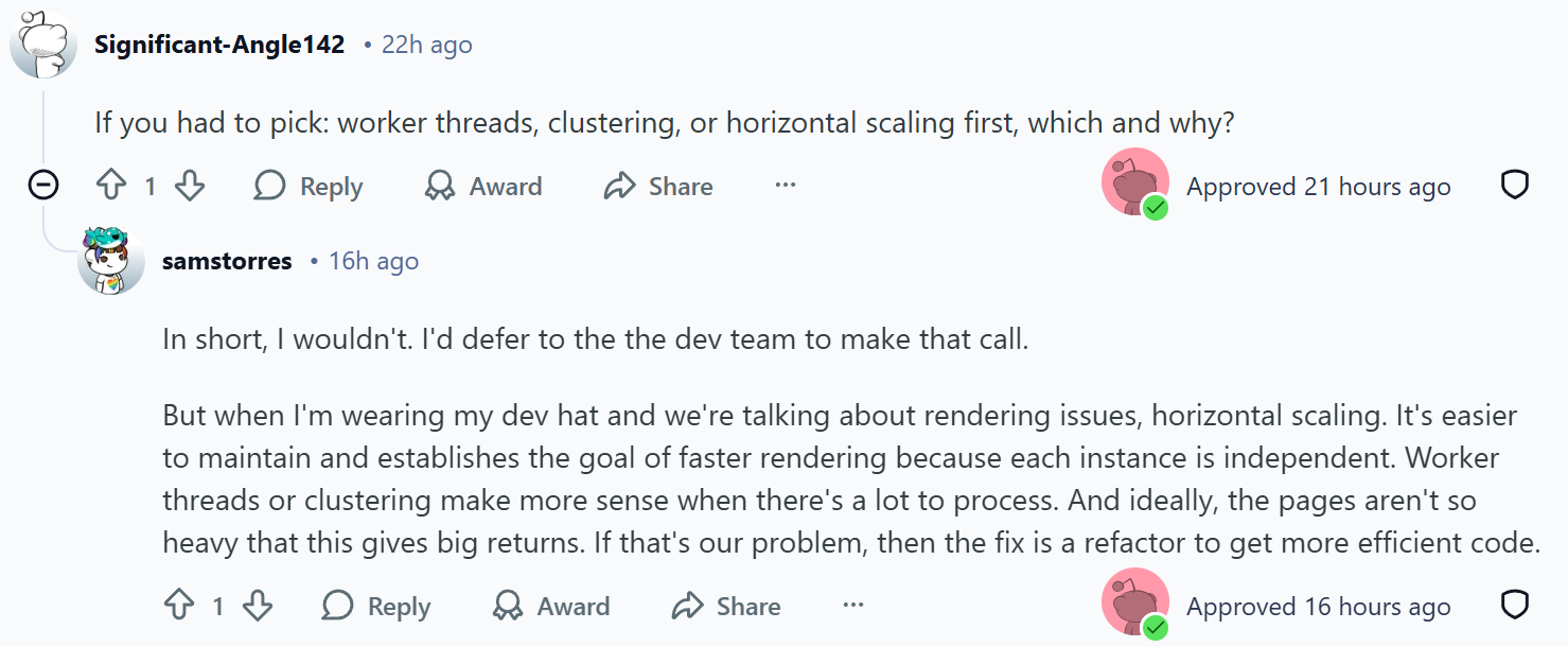 But when I'm wearing my dev hat and we're talking about rendering issues, horizontal scaling. It's easier to maintain and establishes the goal of faster rendering because each instance is independent. Worker threads or clustering make more sense when there's a lot to process. And ideally, the pages aren't so heavy that this gives big returns. If that's our problem, then the fix is a refactor to get more efficient code.