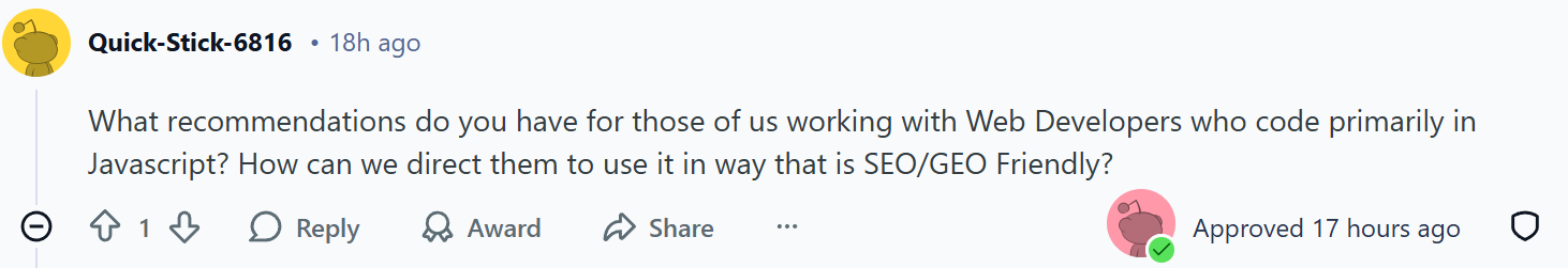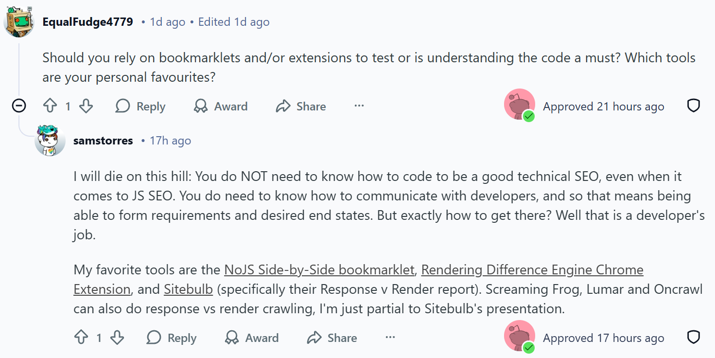 Massive thanks to Sam for her time and insights during this AMA. You can get in on all the JavaScript SEO discussion by joining the subreddit here. And if you haven’t already, make sure you sign up for the free JavaScript SEO training course with Sam (and the incredible Tory Gray)!