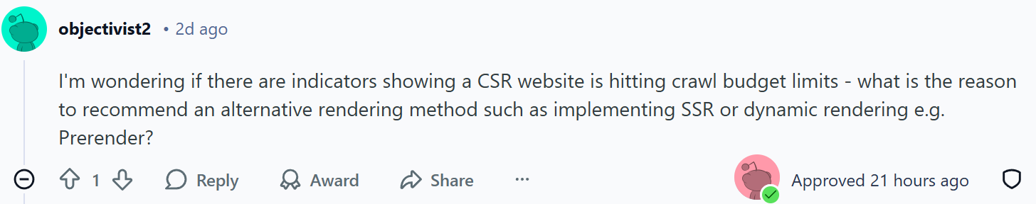 I'm wondering if there are indicators showing a CSR website is hitting crawl budget limits - what is the reason to recommend an alternative rendering method such as implementing SSR or dynamic rendering e.g. Prerender?