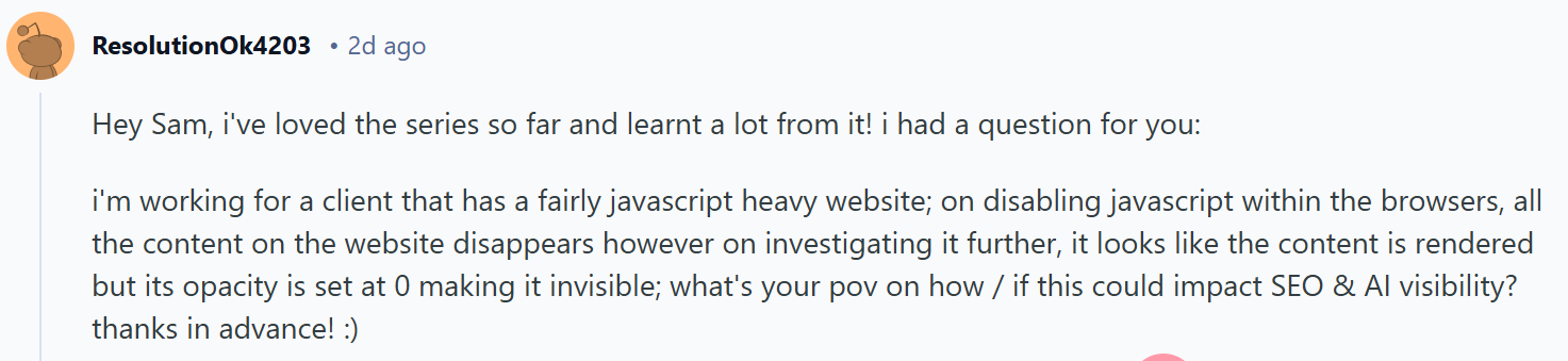 I'm working for a client that has a fairly javascript heavy website; on disabling javascript within the browsers, all the content on the website disappears however on investigating it further, it looks like the content is rendered but its opacity is set at 0 making it invisible; what's your pov on how / if this could impact SEO & AI visibility? thanks in advance! :)