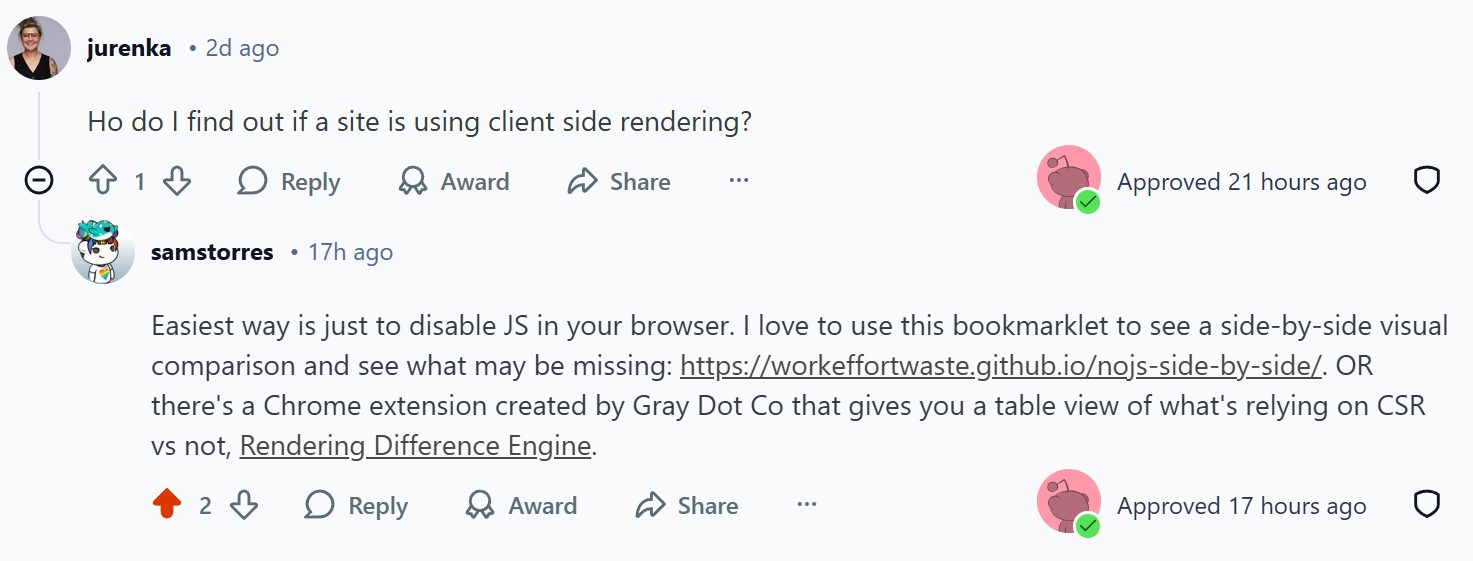 What does this mean you should do differently? You don't need to convert your entire site to SSR or SSG, but I would say prioritize those important page signals and content to be pre-rendered in some form, and not rely on CSR. Most of the popular JS frameworks allow for some components to be statically rendered - so leverage those options. Content like blog articles, product features, etc. These are unlikely to change minute to minute, so have a daily build for those that is easily accessible makes a lot of sense. This also makes crawling and understanding easier for Google, so win win.