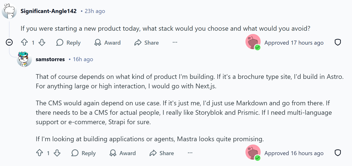 That of course depends on what kind of product I'm building. If it's a brochure type site, I'd build in Astro. For anything large or high interaction, I would go with Next.js.