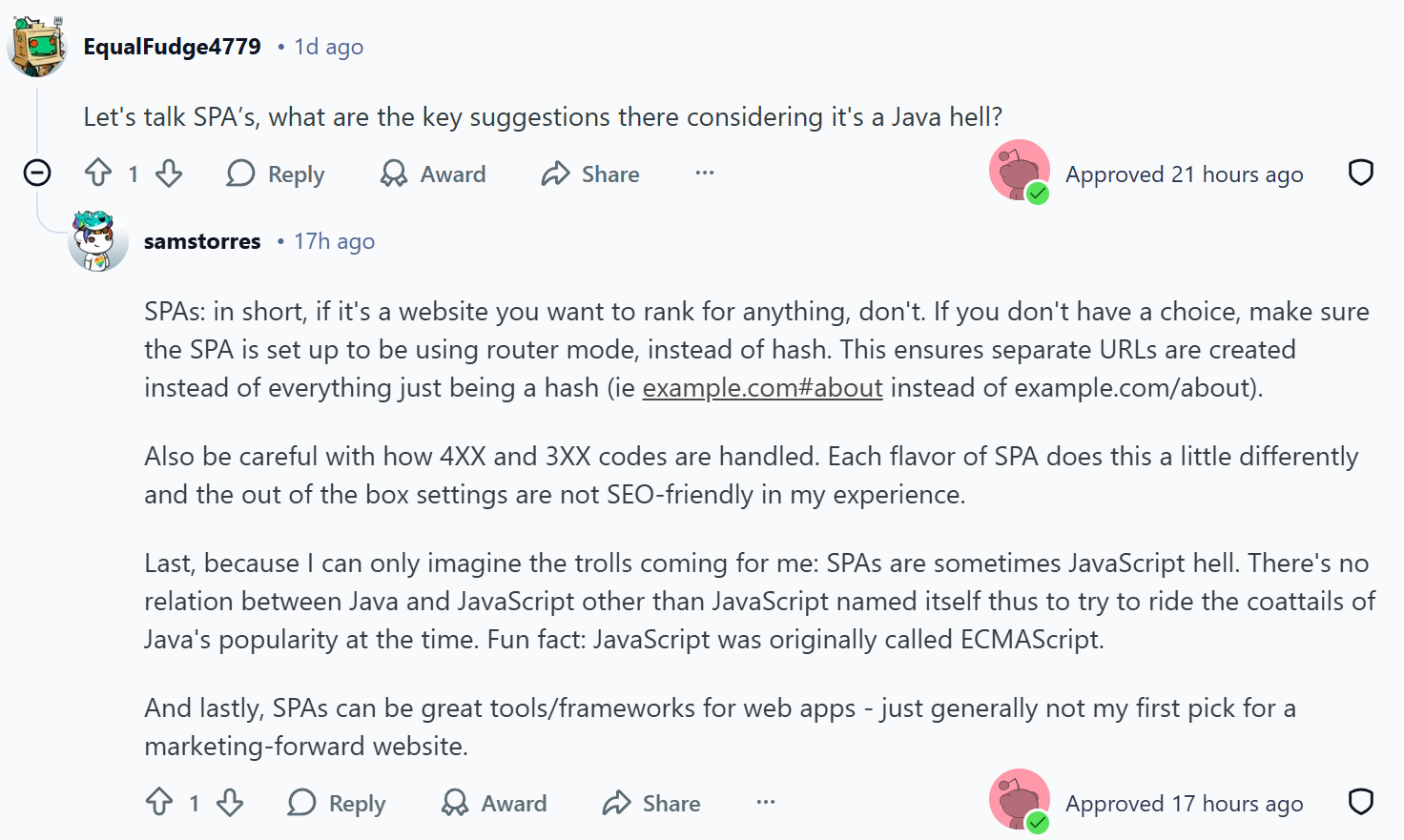 Last, because I can only imagine the trolls coming for me: SPAs are sometimes JavaScript hell. There's no relation between Java and JavaScript other than JavaScript named itself thus to try to ride the coattails of Java's popularity at the time. Fun fact: JavaScript was originally called ECMAScript.