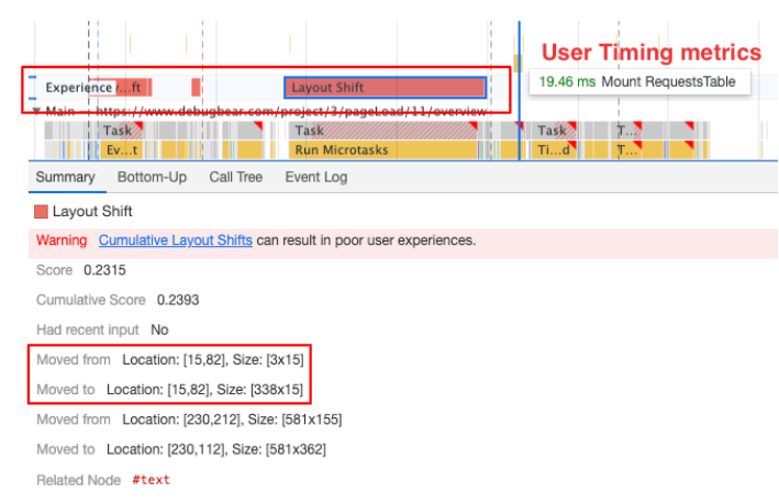 In the example below, we can see a layout shift on the page in the Experience line, which leads to a negative user experience. By clicking on it, you can view the detailed information in the Summary section at the bottom of the page: