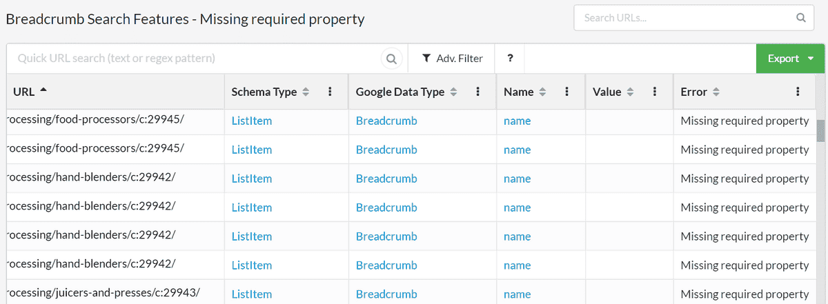 For this reason, Sitebulb's Schema testing tool aggregates issues across multiple pages, so you can pick out the specific template error and list all the pages affected.